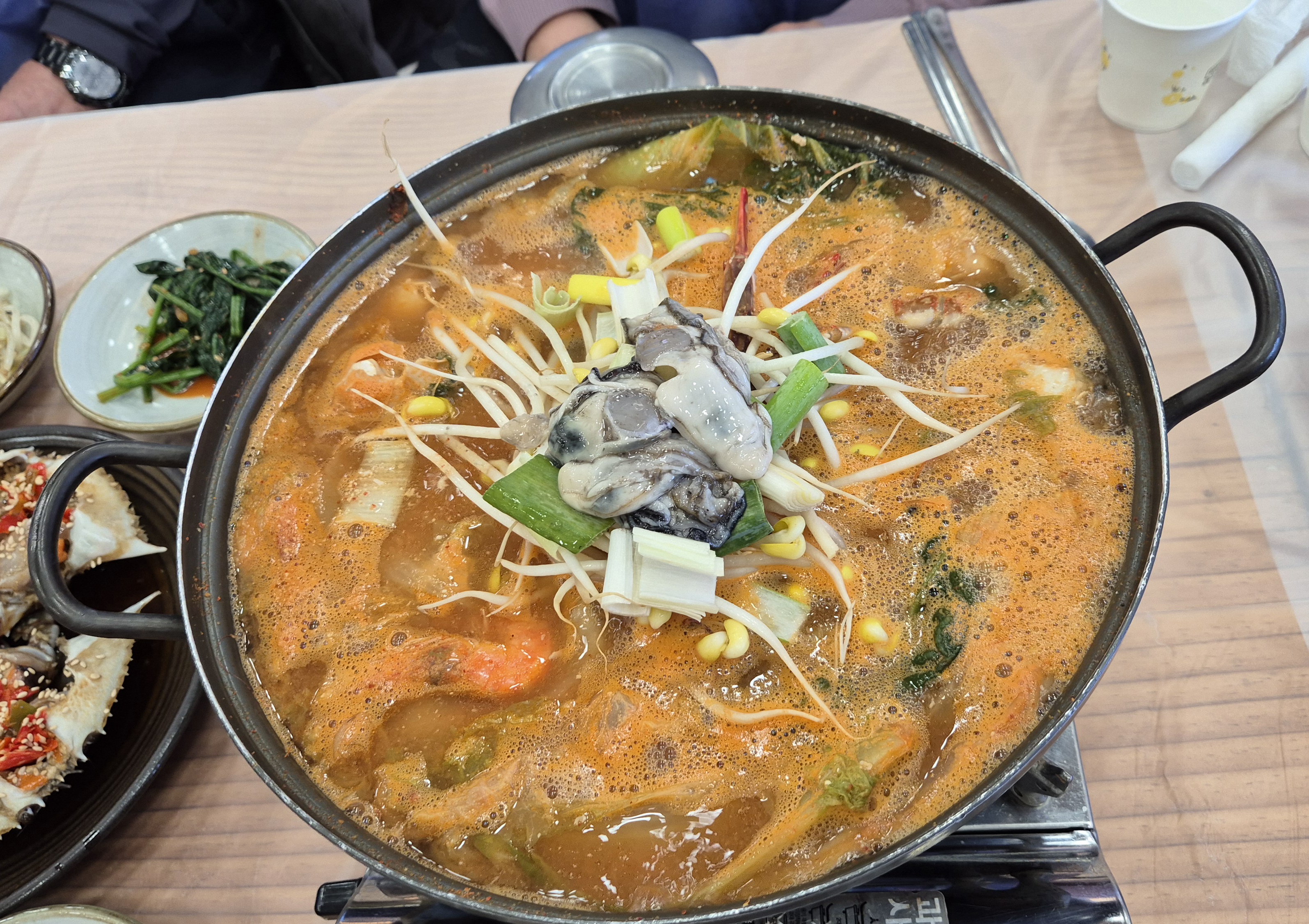 굴이 얹혀 있었고, 꽃게가 4마리, 새우 4마리가 들어가 있었고, 그 외 갖은 야채와 아주 작은 새우가 들어가 있었어요.