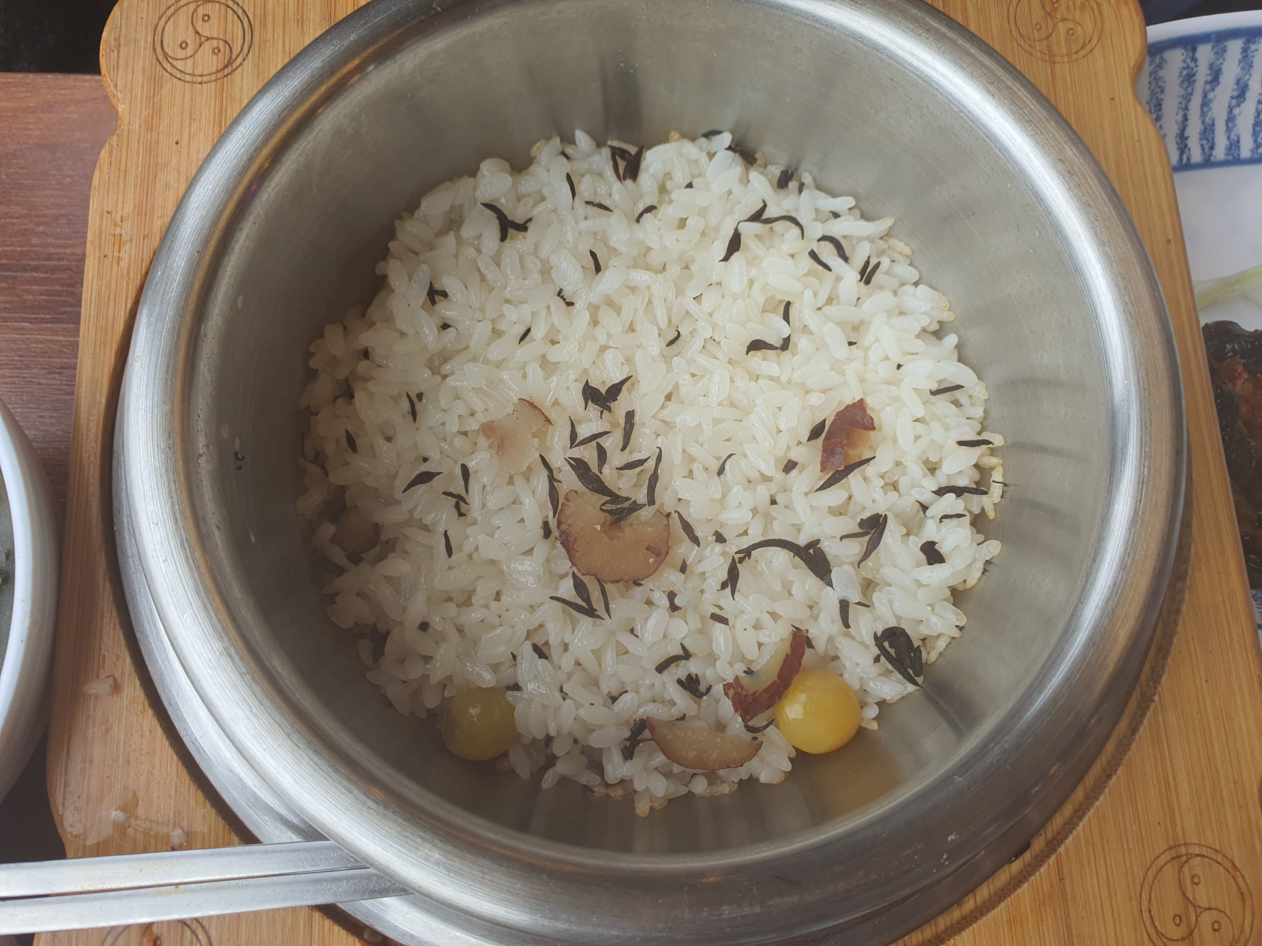 은행, 대추, 해초가 얹힌 갓 지은 돌솥밥은