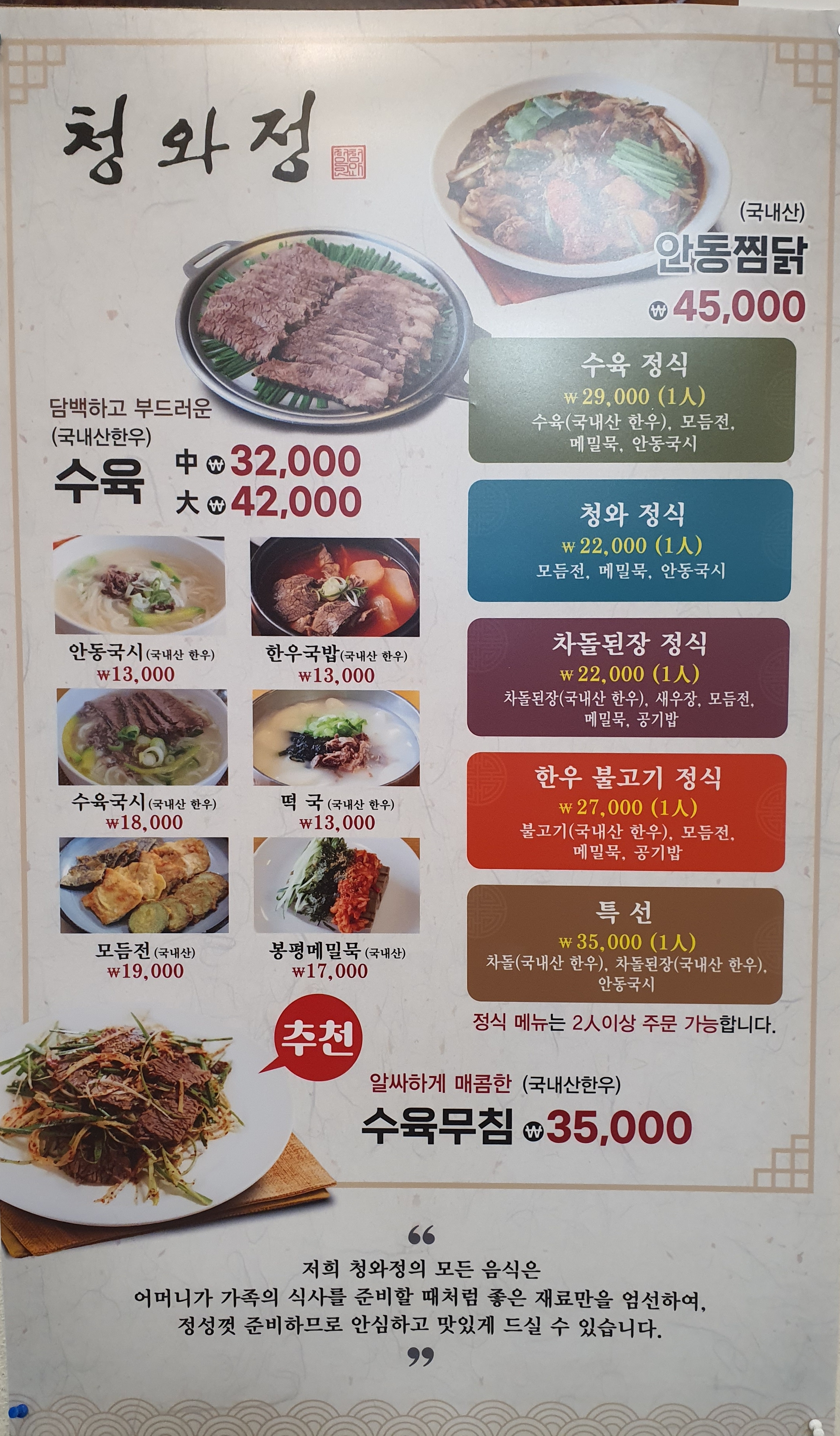 용인시 수지구에는 외식타운이 있습니다. 약 30년 전 수지가 개발이 되고, 근방에 갈 수 있는 곳이 많지 않을 때는 외식타운이 정말 핫 플레이스였습니다. 사람도 엄청 많았었습니다. 요즘은 수지 외곽으로 맛집이며, 카페며 너무 많이 생겨 그때만큼의 인기 있는 외식타운이 아니지만, 주차장에 도착해 보니 여전히 차는 많았습니다. 오랜만에 가서 보니 외식타운 안에는 곰탕집, 삼계탕집, 코다리 찜, 채선당 등 약 10개 정도의 식당이 있었습니다. 저희 일행은 「청와정 」이라는 곳으로 갔습니다.