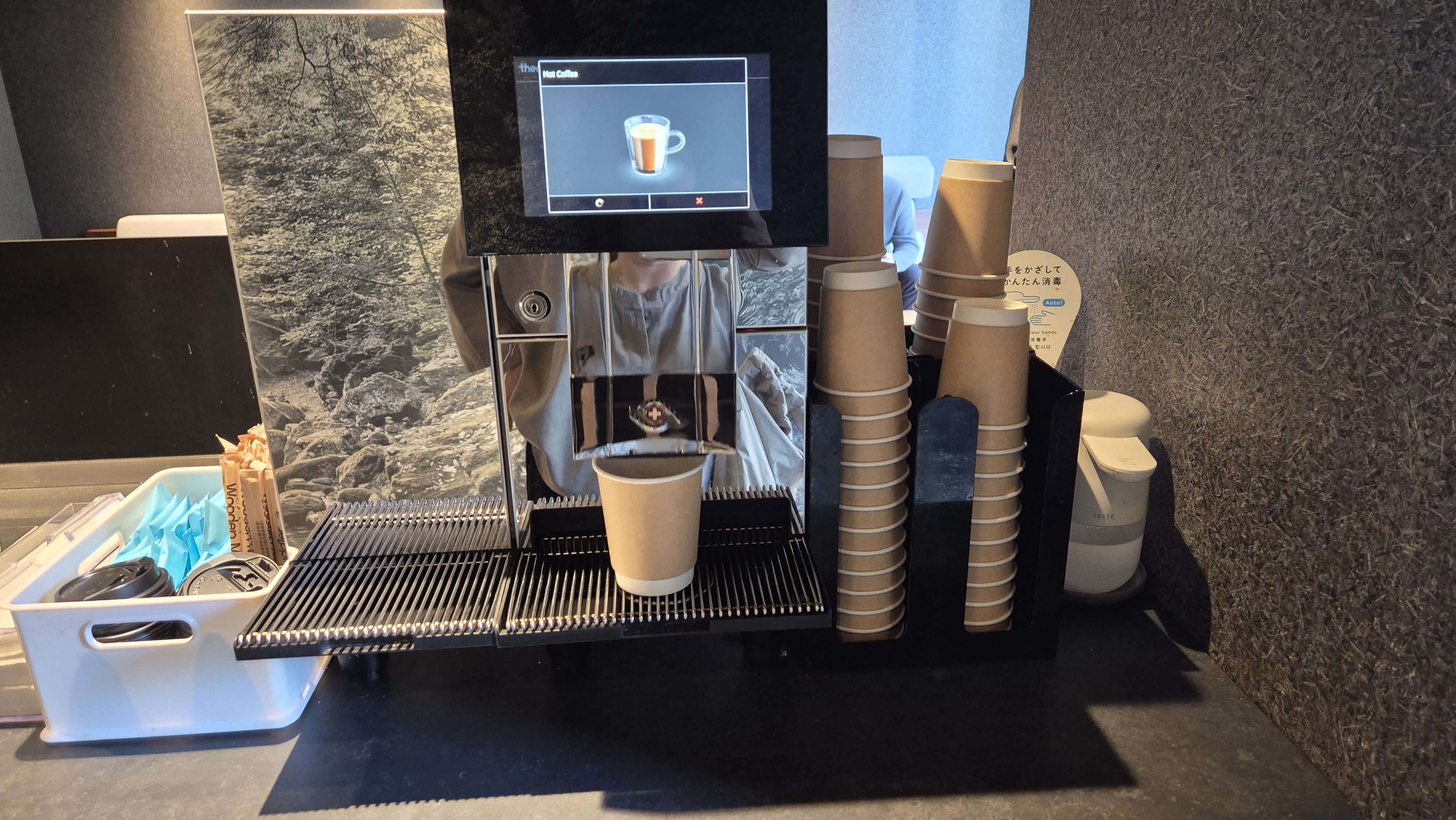 2층 reception 옆에는 부족하면 사용할 수 있는 비품이 비치되어 있었고, 드립백 커피 and 차가 있었어요.